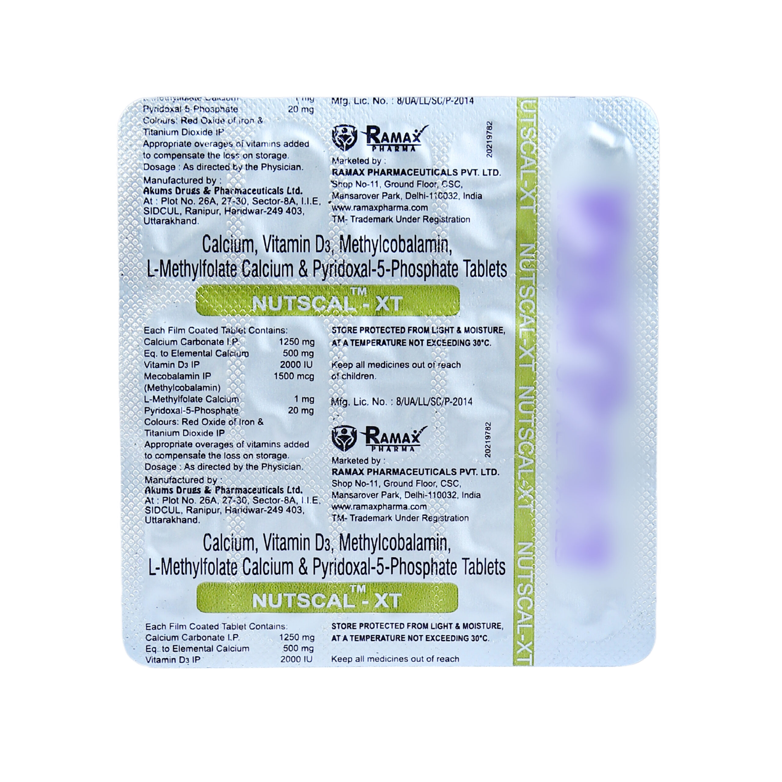NUTSCAL-XT Tablet is a combination of Calcium and Vitamin D3, with 3 essential Vitamins for nutritional deficiencies. It bridges nutritional gaps which are not fulfilled with diet alone and provides necessary supplements, the body needs. It fullfills the deficiency thereby preventing related diseases and supporting overall body functions, growth and health.