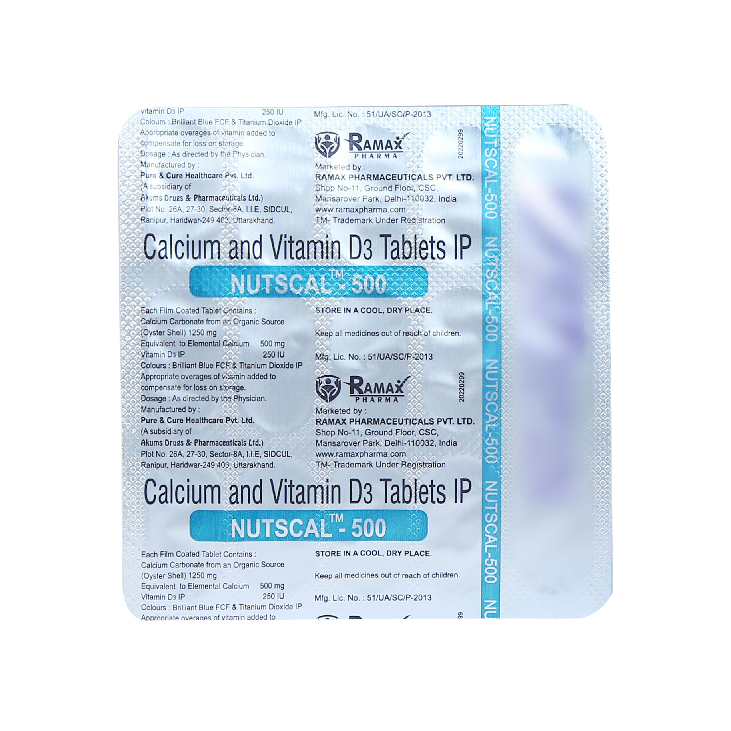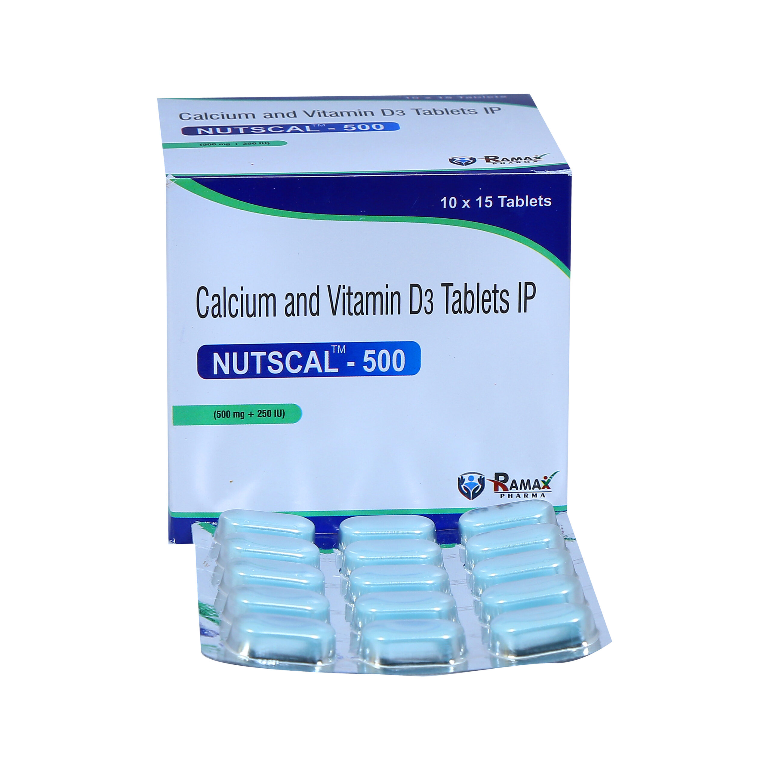 NUTSCAL-500 Tablet is a combination of Calcium and Vitamin D3, for Calcium deficiencies. Calcium is taken from the organic and richest source of Calcium and extracted thru a Long Manufacturing process under stringent quality control. Vitamin D helps in enhancing the absorption of Calcium. It fills the gaps which are not fulfilled with diet alone and provides necessary supplements, the body needs. It helps preventing related Bone diseases and Osteoporosis and supporting overall Bone and Joints health and Muscle Cramps.