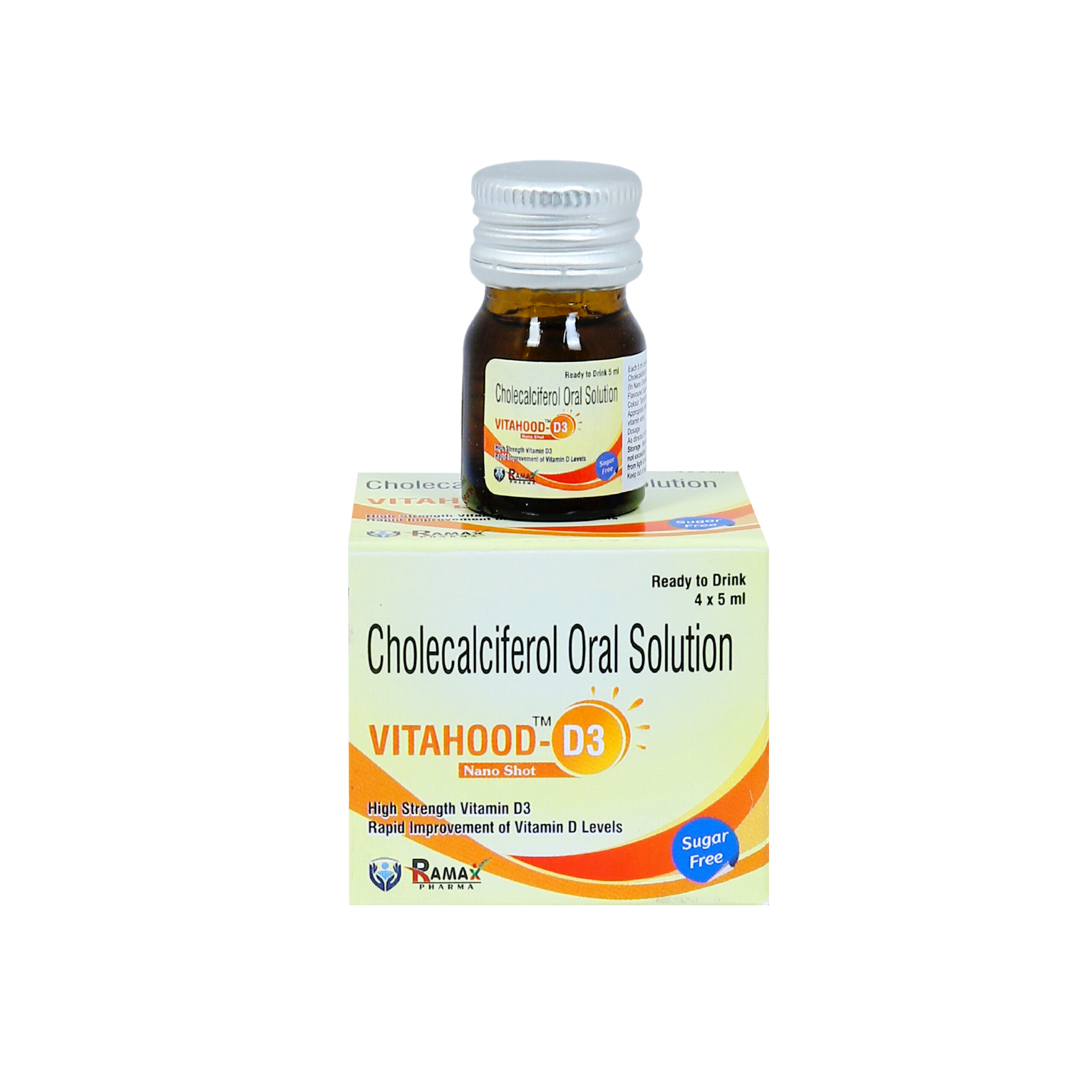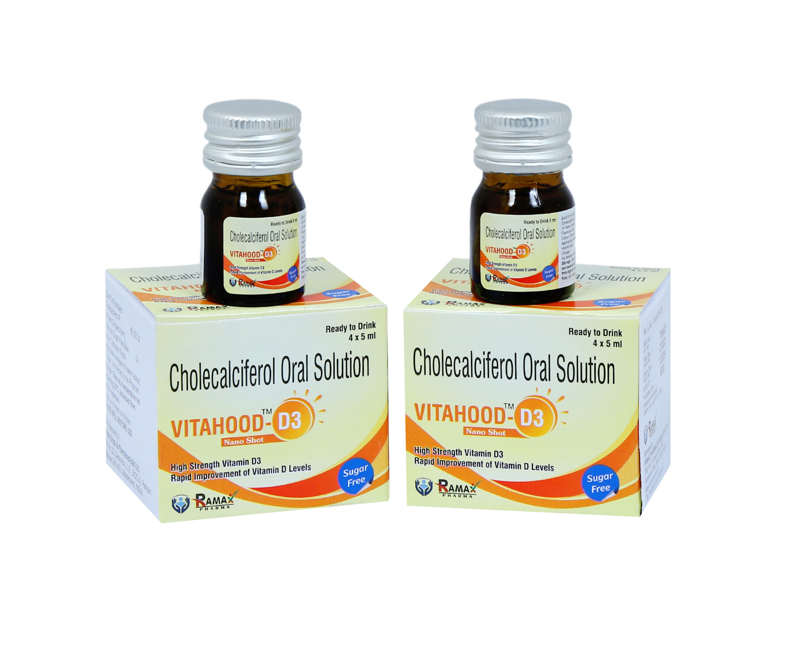 VITAHOOD-D3 offers VITAMIN D (Cholecalciferol) 60000 IU in unique presentation of NANO SHOTs. Due to it’s NOVEL TECHNOLOGY Vitamin D is available in NANO-PARTICLES which helps in BETTER and FASTER ABSORPTION thereby QUICK INCREASE of Vitamin D levels in the Body. READY TO DRINK – NO NEED TO ADD ANYTHING. AND its SUGAR FREE.